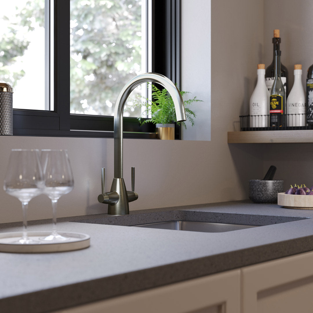The St. James 5005B Ivy Dual Lever Kitchen Tap in brushed chrome offers precise control with its dual lever design, allowing easy adjustment of water temperature and flow. Crafted with durable materials and a sleek brushed chrome finish, this tap combines functionality with a modern aesthetic, making it a reliable and stylish addition to any kitchen. Its smooth operation and robust build ensure lasting performance and ease of use.